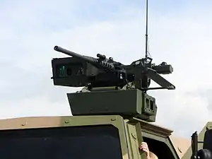 The FLW 200+ (FLW 200Plus) was first revealed at Eurosatory 2012.[9] It is a modified version of the FLW 200, designed to handle even larger weaponry such as autocannons up to the 20 mm caliber. In the case of the prototypes, the FLW 200+ has always been presented with a Rheinmetall Rh 202 gun. The FLW 200+ was demonstrated on a GTK Boxer and on a PMMC G5 from German FFG. The FLW 200+ is intended as simple replacement and upgrade of the original FLW 200. None of the mechanical and electronic interfaces has been altered, making it backwards compatible for upgrading vehicles fitted with the previous version.