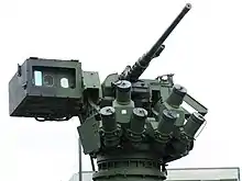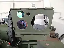 The optronics of the FLW 200 are located in a container mounted at the right side of the gun, whereas the ammo box is located on the left side.[1] The optronics include a colour CCD camera with x10 magnification and a cooled thermal imager, unlike the one of the FLW 100. This increases identification range to 2 kilometres (1.2 mi).[1] The FLW 200 can be fitted with six 76 mm Wegmann smoke grenade dischargers for additional self-protection of the vehicle.