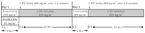 | Fluorouracil | 600 mg/m2 | IV infusion | 22 h | day 1 + 2 |