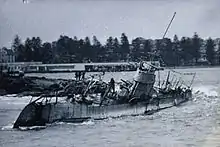 The K-12 was a 611-ton ex-submarine of the Royal Netherlands Navy (later the United States Navy) that was bought by private buyers after World War II and leased to the Port Jackson & Manly Steamship Company, who set her up as a museum ship at a custom berth adjacent to Manly harbour pool.[7] When storms struck in June 1949, an attempt was made by her owners to tow her to a safer berth in Neutral Bay, however the tow ropes broke, and the submarine grounded on rocks near Fairlight Beach.[8] The hull was lightened by salvagers then re-floated on 7 January 1951,[9] and towed up the Parramatta River to Ryde Road bridge; however here she sank again after her seacocks were vandalised. Some sources say that the engines and sections of the bow remain in Fairlight and are accessible by scuba divers.[10] However, they are the remains of a large aluminum speedboat that got blown by high winds and sunk on the night of 7 January 1952.[11][12][13]