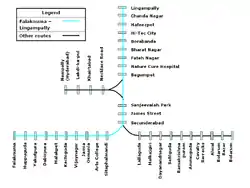 The Falaknuma - Lingampalli route (FL) is a rapid transit service of the Multi-Modal Transport System of Hyderabad, India. Spanning 17 stations, it runs between Falaknuma and Lingampalli 15 times a day.