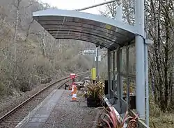 Although Falls of Cruachan station has never had any signalling directly associated with it, its platform falls within the four mile stretch of railway that is protected by the Pass of Brander stone signals.
