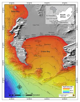 The bathymetry of False Bay differs in character from the west side of the Cape Peninsula. The west coast seabed tends to slope down more steeply than in False Bay, and although the close inshore waters are also shallow, the 100 m contour is mostly within about 10 km of the west coast, while the entire False Bay is shallower than about 90 m.[6] The bottom of the bay slopes down relatively gradually from the gently sloping beaches of the north shore to the mouth, and has a fairly even depth from east to west except close to the shorelines, with three major features disrupting this gentle slope. These are Seal island, Whittle Rock, and the Steenbras ridge. Just outside the bay, there is a large shoal area at Rocky Bank, and a large ridge extending south-west from Cape Hangklip, which channels cold, nutrient-rich water into the west side of the bay during upwelling events.[7]