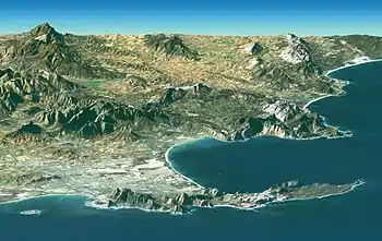 ![]() Eastern False Bay coast aerial view looking somewhat south of east: Gordon's Bay (left) to Cape Hangklip (right) | |