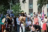 During this rally, most of the country was entering the first day of the first major summer heat wave of 2018, with temperatures ranging between high 90s and triple digits for various cities. Rally organizers cautioned people to use plenty of sunscreen and drink water; a few hundred yards away from the stage in Lafayette Square, a fire truck sprayed its hose in the air to cool off the crowd.[21] | ||