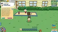 Family Guy Online used cel shaded graphics.[3] The game used typical MMORPG character classes such as having Stewie act as a ranger, Peter as a tank, and Lois as a healer.[4] Players would create their own character using the Griffin family as a template. The actual characters from the show are reserved as non-playable characters (NPCs) in the game in order to give the player quests and advance the storyline (pictured).[4] The NPCs in the game were voiced by the same voice actors in the show.[4]