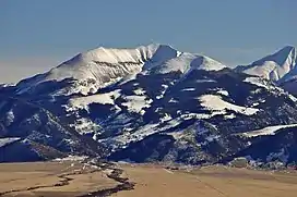 Fan Mountain, 'el. 10,312 feet (3,143 m) is a prominent peak in the Madison Range in Madison County, Montana in the Beaverhead National Forest.[3] The peak is located along the western face of the Madison Range at the northern end of the range. It is due east of Ennis Lake and its prominence and isolation makes it easy to distinguish from Ennis in the Madison River valley.