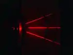 The image on the right shows a laser beam diffracted by a grating into n = 0, and ±1 beams. The angles of the first order beams are about 20°; if we assume the wavelength of the laser beam is 600 nm, we can infer that the grating spacing is about 1.8 μm.
