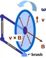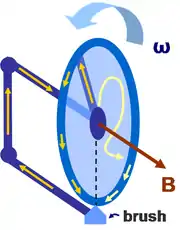 Careful thought showed that, if the magnetic field was assumed to rotate with the magnet and the magnet rotated with the disk, a current should still be produced, not by EMF in the disk (there is no relative motion between the disk and the magnet) but in the external circuit linking the brushes,[9] which is in fact in relative motion with respect to the rotating magnet. (The brushes are in the laboratory frame.)