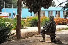 A U.S. Army soldier provides security at the hospital during a meeting between Americans and the hospitals employees, 2012