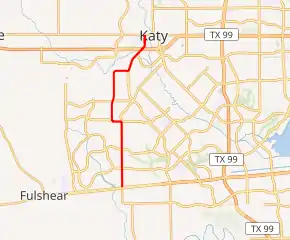 FM 1463 begins in rural Fort Bend county, at an intersection with FM 1093 / FM 359.[2] The route travels north through rural areas of Fort Bend County before entering Katy. It has a junction with IH 10 at its Exit #740. After crossing the interstate, the route continues through Katy, passing Katy High School, before ending at an intersection with US 90 near the Waller County and Harris County lines.[1]