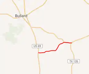 FM 177 has no local street names. Mostly rural for all of its length, FM 177 passes by a landscape of rolling hills of trees and farmland. All of FM 177 has 2 lanes and no shoulders. The road serves just the 2 towns of Mount Selman and Mixon. The western terminus intersection connects to US 69 which goes south to Jacksonville and north to Tyler; while the eastern terminus intersection connects to TX 135 which goes northeast to Troup, and south to Jacksonville. FM 177 has intersections at county roads, besides its intersections with FM 2493 west of Mixon and FM 3052 in Mixon, and its termini at US 69 in Mount Selman and at TX 135 in Mixon.[1][2][3]
