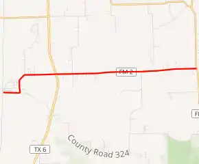 FM 2 begins in the village of Courtney, at Grimes County Road 237 about 1.5 miles (2.4 km) east of the Washington County line (Brazos River). It travels along the northeastern edge of the Texas Department of Criminal Justice's O.L. Luther Unit. It then continues through rural farmland in Grimes County. It then travels east, crossing Texas State Highway 6 (SH 6) and passing several prison farms before ending at FM 362.[1][2]