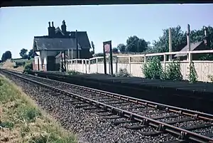 Farthinghoe station was situated on the busiest section of the line, the 5½ mile stretch from Merton Street to Cockley Brake, where there was a junction with the Stratford-upon-Avon and Midland Junction Railway (SMJ).[8] Opened on 1 June 1872, the section provided connections to Towcester and Blisworth.[9] The LNWR and SMJ jointly served Farthinghoe and Merton Street until they were absorbed into the London, Midland and Scottish Railway on 1 January 1923 upon the railway grouping. The station lost its stationmaster from 1930 and came under the control of Banbury, only 3½ miles away.[10] Former SMJ passenger services were withdrawn as from 2 July 1951.[9] Farthinghoe was itself to close to passengers the following year.[11]