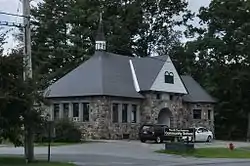 The Farwell School stands in the village of North Charlestown, on the west side of River Road (NH 12A) south of its junction with Ox Brook Road. It is a single-story stone structure, built out of rusticated granite and covered by a hip roof. The right side has a rounded single-story turret, and the peak of the ridge has a small belfry at its left end. A gabled pavilion projects slightly from the center of the front facade, with the entry recessed under a rounded archway, and a clapboarded gable finish above. A band of three casement windows extends to the left of the entrance, with a similar group of four on the left side.[2] The building has been extended to its rear with more modern facilities.