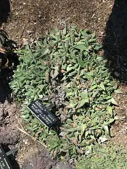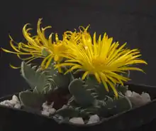 Faucaria tigrina, tiger jaws (a name it shares with Faucaria felina), is a species of succulent plant in the family Aizoaceae. It is endemic to South Africa, but also widely spread in cultivation. It has fleshy triangular leaves, a clumping habit, and blooms in autumn with yellow daisy-like flowers.