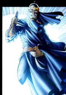 A master sorcerer, Felix Faust possess a plethora of knowledge on the occult, spells, rituals, and curses and is capable of affecting organic matter with his magical abilities.[12] He is well-versed in many different kind of magic, including black magic[13] and soul magic.[14] These skills enable him to perform many magical feats, including energy manipulation, resurrections, communing with the dead,[15] elemental control, intangibility, transmutation, illusion casting, telepathy, scrying,[16] and more. Despite his master level in the sorcerous arts, Felix's power wanes and waxes, having lost much of his magical power after being displaced into a dimension for centuries and is unable to properly attain his full powers. Unlike other powerful magicians, Felix is required to use books or scrolls of spells to focus his powers.[17] He also works through familiars in order to achieve his magical power without being able to truly initiate magic on his own.[16]