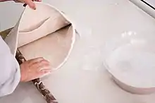 In the wet felting process, hot water is applied to layers of animal hairs, while repeated agitation and compression causes the fibers to hook together or weave together into a single piece of fabric.[14] Wrapping the properly arranged fiber in a sturdy, textured material, such as a bamboo mat or burlap, will speed up the felting process. The felted material may be finished by fulling.