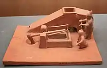 Based on the archaeological evidence provided by pottery models of the winnowing machine, the winnowing machine was constructed within the courtyard wall that had querns and trip hammers placed near it.[2] The machine also had a crank operated rotary fan with four blades, an air inlet, and hopper as well as a box, crank, and vanes.[4] The device was able to operated by hands or feet. The crank consists of four to six vanes that are made of thin boards. When operated, grains are placed in the gap through the funnel where they fall down. The vanes would then spin and then separate the lighter husks by blowing them away with the grains with no husks that would fall to box's bottom.[5]