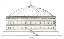 The gasometer is a cylinder 56 metres (184 ft) in diameter, 21 metres (69 ft) high exclusive of the cupola[2] and 27 metres (89 ft) high in total. Its form was based on an 1827 design by Karl Friedrich Schinkel for a circular church.[3][4] The capacity of the telescoping gas container was 30,000 cubic metres.[5]