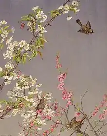 Bridges visited England between 1879 and 1880. During that time she visited her brother Henry, who worked there as a tea-taster and traveled to China in the commission of his work. Her works, which reflected an Oriental aesthetic with plain background and asymmetrical compositions, were exhibited at the Royal Academy of Arts.[5] Some of her compositions are similar to that of the Flower and Bird series of Japanese woodblock print artist, Hiroshige.[10]