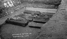 The burials were scheduled to take place on 5 April [O.S. 23 March] 1917, but prior to this news circulated that there would not be any funeral rites.[4] Relatives of the dead hurried to claim and bury them in other cemeteries with the traditional rites.[3] Ultimately only 184 victims were buried on the Field of Mars, comprising 86 soldiers, 9 sailors, 2 officers, 32 workers, 6 women, 23 people for whom social status could not be determined, and 26 unknown dead.[3][10] The city soviet declared 5 April a day off work, and many citizens turned out to accompany the funeral processions, which carried the dead from the hospitals and chapels across the city. The graves had been prepared by blasting trenches in the frozen ground, with the lowering of each coffin marked by a cannon shot from the Peter and Paul Fortress.[11] By one estimate some 800,000 people attended the funerals.[10] A competition for the design of the memorial was won by Lev Rudnev and the Monument to the Fighters of the Revolution was opened on 7 November 1919.[2][4] Epitaphs by Anatoly Lunacharsky, People's Commissar of Education, were inscribed around the memorial.[2][4][10]