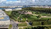 During the reign of Empress Catherine I, the field was termed the "Meadow in front of the Summer Palace" (Russian: Луг перед Летним дворцом), and during the reigns of her successors Empress Anna and Empress Elizabeth, it became the site of their Summer Palaces, designed by Francesco Bartolomeo Rastrelli. Under Empress Anna, the land was used to host military exercises and parades for two weeks every autumn. After these parades the officers dined in the Summer Palace, while the soldiers ate on the meadow.[3] In February 1740 Empress Anna ordered repairs and improvements to the square, including the planting of trees and the removal of some buildings. Architect Mikhail Zemtsov designed 24 garden pavilions, and oversaw the laying out of new paths and tree planting carried out by Harmen van Bol'es and his apprentice Ilya Surmin. A fountain decorated with dragons, dolphins, and mascarons by Konrad Osner was placed in the centre of the square.[3] Further work took place in the early reign of Empress Elizabeth, with new walkways and tree planting.[2][4] The square became known as the "Promenade" (Russian: Променад), and it continued to house attractions and kiosks on public holidays.[3] It was still a popular location for the houses of the rich and powerful, with the former residence of the Duke of Holstein-Gottorp presented by Empress Elizabeth to her favourite, Alexei Razumovsky. Also with their houses here at this period were the court physician Jean Armand de Lestocq and the military commander Stepan Fyodorovich Apraksin.[3]