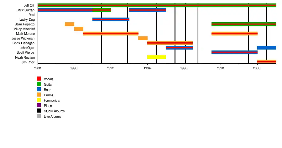 | Past members | Jeff Ott Jack Curran Mikey Mischief Mark Moreno Jean Repetto Lucky Dog Chris Flanagan John Ogle Jesse Wickman Joe Cable John Quintos Scott Pierce Jim Prior Lisa D. Vanessa Bain |