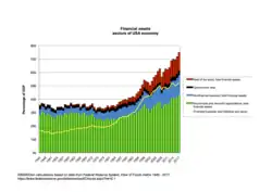 U.S. federal deregulation in the 1980s of many types of banking practices paved the way for the rapid growth in the size, profitability and political power of the financial sector. Such financial sector practices included creating private mortgage-backed securities,[14] and more speculative approaches to creating and trading derivatives based on new quantitative models of risk and value,.[15] Wall Street ramped up pressure on the United States Congress for more deregulation, including for the repeal of Glass-Steagall, a New Deal law that, among other things, prohibits a bank that accepts deposits from functioning as an investment bank since the latter entails greater risks.[16]