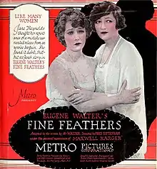 Fine Feathers is a 1921 American silent film directed by Fred Sittenham and starring Eugene Pallette, Claire Whitney, Thomas W. Ross, Warburton Gamble and June Elvidge, produced and distributed by Metro Pictures Corporation. The library of Congress shows a release date of June 20, 1921[1] but there is evidence that Fine Feathers was being screened on June 18 at the Rose Theater[2] in Santa Rosa California and as early as June 17 at the Star Theater in Monterey California.[3] This production is the second movie adaptation of Eugene Walter's 1912 play of the same name. Three complete 35 mm copies were donated by M.G.M. to the U.S. Archive.[1] A nitrate picture negative, an acetate positive print and an acetate fine grain master, all kept at the Eastman Museum in Rochester, NY.[4]