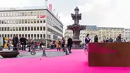 Barbara Schock-Werner had already criticised the object at this location during her tenure as cathedral architect, since it was charged with a significance in the middle of the cathedral's visual axis that it did not have.[8] City dean Robert Kleine also supported the decision,[9] as well as the then cathedral provost Norbert Feldhoff, the architect Allmann Sattler Wappner commissioned with the cathedral slab reconstruction as well as Marcus Trier from the Romano-Germanic Museum. Overall, the "majority of the interlocutors" in public and private discussions of the "Urban Congress" had considered the current location "unsuitable both for the Dove Fountain and for the perspective on the main portal of the cathedral".[10] After the publication of the plans, opposing voices were found in letters to the editor and comments in the daily press as well as in an online petition, which found almost 2900 supporters.[11] In politics, at the district level, the Greens, Die Linke, Deine Freunde and Pirates were in favour of demolition; in the city council, the SPD was against it, the CDU was in favour of a move to the Burgmauer, although both groups questioned in principle the decision-making power of the district council on this point.[12] A dialogue commissioned by the city council at the end of 2015 between the new Lord Mayor Henriette Reker and District Mayor Andreas Hupke led to the compromise that the finial would remain in its place for the time being until the planned renewal of the western cathedral surroundings.[13]