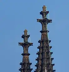 The finials of Cologne Cathedral form the tops of the two towers (north and south towers) at a height of 149 to 157 metres. A copy of this finial in original size, but made of concrete, has stood below the steps in front of the west façade of the cathedral since 1991.