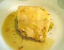 Finnan haddie (also known as Finnan haddock, Finnan, Finny haddock or Findrum speldings) is cold-smoked haddock, representative of a regional method of smoking with green wood and peat in north-east Scotland.[1]