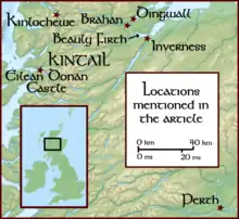 According to tradition, the Macraes were originally from Ireland, and shared a common ancestry with the Mackenzies and Macleans. The Macraes were said to have originated from Clunes, which is located near the southern shore of the Beauly Firth, and was within the lordship of Lovat. Alexander Macrae stated that these traditions likely refer to a period sometime in the middle of the 13th century.[4] According to John Macrae, after a violent dispute arose between the Macraes and more powerful Frasers of Lovat, three sons of the Macrae chief set off for new lands. One of the sons settled in Brahan, near Dingwall (later the site of Brahan Castle); another settled in Argyll; and the other settled in Kintail.[2]