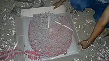 Until the mid-1980s, firecracker production was low-tech. They were handmade, beginning with rolling tubes. Once the firecracker tubes were rolled by hand (commonly from newspaper) and labelled, and then filled with powder, their ends were crimped and fuses inserted, all by hand. These finished firecrackers were usually braided into "strings" and sold in packs which came in many sizes, from the very small ("penny packs" containing as few as four to six firecrackers) to the most common size packs (containing 16 and 20 crackers per pack), to larger packs (containing 24, 30, 32, 40, 50, 60, 72, 90, 100, and 120 firecrackers), to huge "belts" and "rolls" (packages containing strings of several hundred to several thousand crackers—Phantom Fireworks sells rolls as large as 16,000 firecrackers[8]). Firecracker packages were wrapped in colourful and translucent glassine paper, as well as clear cellophane, with glassine the most popular.