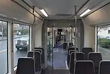 The First Hill Streetcar uses a fleet of six low-floor Inekon 121 Trio streetcars that are maintained and operated by King County Metro.[74][82] The articulated streetcars measure 66 feet (20 m) long, 8 feet (2.4 m) wide, and have two operator's cabs for bidirectional operations.[83] They each have 30 seats and capacity for 40 additional standing passengers, along with two wheelchair locations; to board wheelchairs and bicycles, a mechanical bridge plate is deployed by the operator from one of two doors in the center section.[84] A third door is located near the operator's cab in the raised section above the truck, which has seating accessed by a stair.[74] A set of digital displays inside the car show upcoming stops, which are also announced by an audio message.[85]