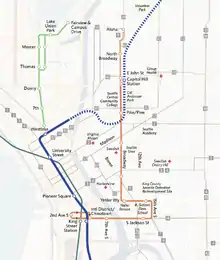 A streetcar network plan published by the city government in 2008 explored extensions of the First Hill line to the Central District and on Rainier Avenue, connecting Broadway to the Mount Baker light rail station at Martin Luther King Jr. Way.[15][56] The initial plans for the First Hill line included service north of Denny Way to Aloha Street, but this section was eliminated under the Sound Transit 2 funding plan.[57][58] The 1⁄2-mile (0.8 km) streetcar extension was supported by community groups and merchants in the Broadway business district, who lobbied the city to study and design the $20 million project in 2010.[59] A car tab fee rejected by city voters in 2011 would have funded $18 million for various streetcar projects, including the Aloha extension.[27][60]