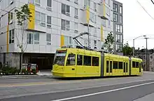 The streetcars, numbered 401 to 407, were built by Czech manufacturer Inekon Trams, who also supplied the vehicles for the South Lake Union line and the Portland Streetcar system.[86] The fleet was manufactured in Ostrava by Inekon and shipped to Seattle for final assembly by Pacifica Marine in 2015, falling significantly behind schedule and delaying the start of service.[39][87] The streetcars draw their electrical power from overhead catenary that is energized at 750 volts direct current. Unlike the 12 Trio models used for the South Lake Union line, the 121 Trio features an on-board energy storage system that allows streetcars to run off-wire on downhill sections of the route and recharge the battery using regenerative braking.[74] The streetcars are painted in colors to represent neighborhoods on the route, including baby blue for First Hill's hospitals, metallic gold for Pioneer Square's role in the Klondike gold rush, jade green for Little Saigon, hot pink for Capitol Hill, and red and yellow for Chinatown-International District.[88]