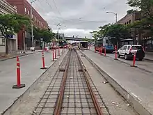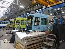 Street construction and electrical installation were completed in late 2014, but the commencement of service was delayed to the following year due to procurement issues with the Czech streetcar manufacturer, Inekon Trams, and a Seattle-based partner that would assemble half the fleet.[34] Inekon's delay was blamed on an existing backlog of orders, the battery systems, and a redesign required by a change in fire regulations.[35] The project overran its $134 million budget by $1.6 million, which was paid by Inekon as part of their contract penalties.[36] Testing of the first streetcar began in March 2015 and acceptance tests were completed on all five vehicles by October.[37][38] The final phase of testing, including 310 miles (500 km) of operation and a five-train simulation, was completed in early January 2016.[39][40]