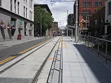 The streetcar follows Broadway uphill into First Hill, stopping at Terrace Street near the Harborview Medical Center and Marion Street at the Swedish Medical Center on the west side of the Seattle University campus.[27] The line then crosses into Capitol Hill and serves a set of stops between Pike and Pine streets in the center of the city's main nightlife district.[73] Streetcars then pass the Seattle Central College campus and Cal Anderson Park before merging into a single track on the west side of Broadway. The First Hill line terminates at a stop on the south side of East Denny Way, adjacent to the west entrance of the Capitol Hill light rail station.[68][73]