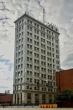 The First National Bank Building, known locally as the Bresee Tower, is a historic bank building at 2-4 N. Vermilion Street in Danville, Illinois. The building was constructed in 1918 for the First National Bank, which was established in 1857 and had operated in another building at the same site since 1867. Chicago architecture firm Mundie & Jensen designed the building in the Classical Revival style, a popular choice which was also used in several of Danville's other banks. Like many Classical Revival skyscrapers, the twelve-story building is divided into a two-story base, a shaft, and a one-story capital to resemble a Greek column. The entire exterior of the building is clad in terra cotta, and its decorative elements include pilasters, ornate metal entrance surrounds, and a bracketed entablature.[2]