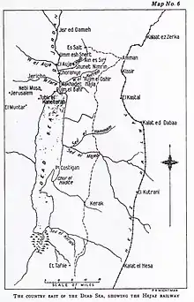 Military cooperation between the Arabs and the British Empire forces was expected during these Transjordan operations although it was to be fairly limited.[16][18] T. E. Lawrence and the forces of the Arab Revolt based on Aqaba had blown up lengths of rail track, bridges and Ottoman supply trains with explosives. In early March Sherifian Arabs led by the Emir Feisal and guided by Lawrence were raiding Ottoman units south of El Kutrani and were in some force about Tafila on 11 March but withdrew a week later. In response the Ottoman Army sent a strong force including a German infantry battalion south from Amman to defend the railway and the important town of Ma'an. The Bedouin near Madaba were inclined to be hostile to the Ottoman Army and it was hoped that the planned attack on Amman might attract their support.[18][19][20]