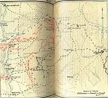 The attack on Amman began on 27 March and continued until 30 March while German and Ottoman reinforcements continued to steadily arrive along the unharmed Hejaz Railway from the north.[87] About 4,000 to 5,000 German and Ottoman soldiers with rifles and 15 guns were in position covering the railway viaduct and tunnel while another 2,000 Ottoman soldiers moved towards Es Salt from the north.[30][31][32] An additional 15,000 German and Ottoman troops with 15 guns reinforced Amman, while at dawn on 27 March two British infantry battalions of the 181st Brigade, left Es Salt to reinforce the two brigades of the Anzac Mounted Division (commanded by Chaytor) and the Imperial Camel Corps Brigade with three mountain gun batteries, in their attack on Amman. The British infantry reinforcements were delayed near Suweileh by local fighting between Circassians and Arabs, while a Royal Horse Artillery (RHA) Battery also moved from Es Salt towards Amman with great difficulty, arriving on the last day of battle.[31][91]