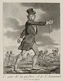 The White Terror (French: Terreur Blanche) was a period during the French Revolution in 1795 when a wave of violent attacks swept across much of France. The victims of this violence were people identified as being associated with the Reign of Terror – followers of Robespierre and Marat, and members of local Jacobin clubs. The violence was perpetrated primarily by those whose relatives or associates had been victims of the Great Terror, or whose lives and livelihoods had been threatened by the government and its supporters before the Thermidorean Reaction. Principally, these were, in Paris, the Muscadins, and in the countryside, monarchists, supporters of the Girondins, those who opposed the Civil Constitution of the Clergy and those otherwise hostile to the Jacobin political agenda.[1]