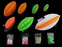 Floats come in different sizes and shapes, and can be made from various materials, such as foam, balsa wood, cork, plastic, Indian sarkanda reed,[1] or even bird/porcupine quills. The float is used to enable the angler to cast out a bait away from the shore or boat while maintaining a reference point to where the bait is unlike bottom or leger fishing. The angler will select an appropriate float after taking into account the strength of the current (if any), the wind speed, the size of the bait he or she is using, the depth the angler wishes to present that bait at and the distance the bait is to be cast.[2] Usually, the line between the float and hook will have small weights attached, ensuring that the float sits vertically in the water with only a small brightly coloured tip remaining visible. The rest of the float is usually finished in a dull neutral colour to render it as inconspicuous as possible to the fish. Each float style is designed to be used in certain types of conditions such as slow or fast rivers, windy or still water or small confined waters such as canals.