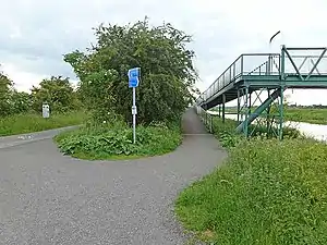 ![]() Five Mile Bridge modern footbridge across the Witham. The cycle track on the left is the old trackbed. The old wooden platforms were a few yards from here. | |
