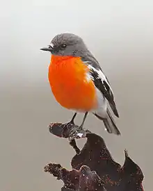 The flame robin (Petroica phoenicea) is a small passerine bird native to Australia. It is a moderately common resident of the coolest parts of south-eastern Australia, including Tasmania. Like the other two red-breasted Petroica robins—the scarlet robin and the red-capped robin—it is often simply called the robin redbreast. Like many brightly coloured robins of the Petroicidae, it is sexually dimorphic. Measuring 12–14 cm (4.7–5.5 in) long, the flame robin has dark brown eyes and a small thin black bill. The male has a brilliant orange-red chest and throat, and a white patch on the forehead above the bill. Its upper parts are iron-grey with white bars, and its tail black with white tips. Female coloration is a muted grey-brown. Its song has been described as the most musical of its genus.