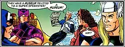 The museum's curator since its founding is Dexter Myles, a former Shakespearean actor given the job by Barry Allen after his assistance in foiling a robbery.[3] The museum is depicted in JLA/Avengers #1 (September 2003), and is the site of a battle between the Scarlet Witch and Quicksilver against Black Canary, Blue Beetle, and Hawkman to retrieve the Wand of Watoomb, which is won by the Avengers after the Witch uses her chaos magic to knock out the other fighters.