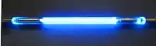 All gases produce spectral lines which are specific to the gas, superimposed on a background of continuum radiation. With all gases, low current-densities produce mostly spectral lines, with the highest output being concentrated in the near-IR between 650 and 1000 nm. Krypton's strongest peaks are around 760 and 810 nm. Argon has many strong peaks at 670, 710, 760, 820, 860, and 920 nm. Neon has peaks around 650, 700, 850, and 880 nm.[14] As current densities become higher, the output of continuum radiation will increase more than the spectral-line radiation at a rate 20% greater, and output center will shift toward the visual spectrum. At greybody current-densities there is only a slight difference in the spectrum emitted by various gases. At very high current-densities, all gases will begin to operate as blackbody radiators, with spectral outputs resembling a blue giant star, centered in the UV.[14]