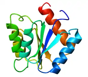 Ribbon diagram of CheY (a regulator of the chemotactic response in bacteria, PDB accession code 3CHY), which adopts the flavodoxin fold. Ribbon is colored from blue (N-terminus) to red (C-terminus).